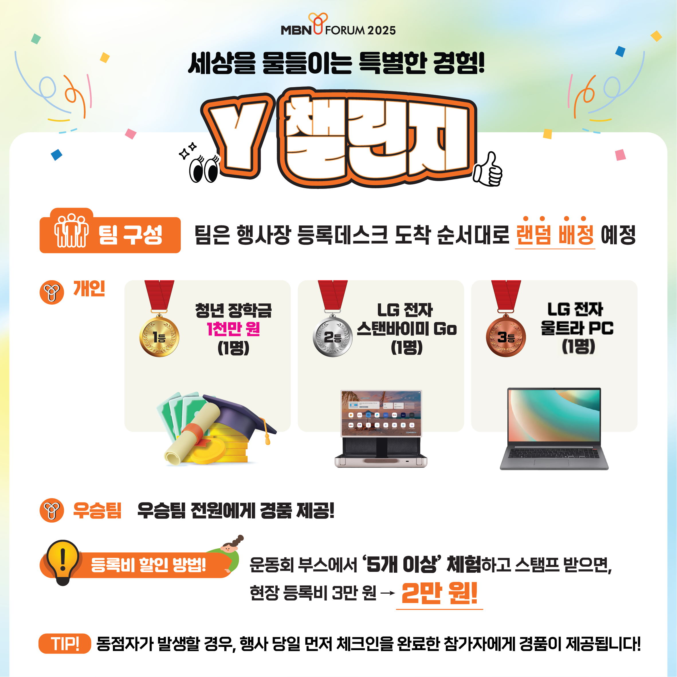 MBN Y 포럼은 ‘Y 챌린지’를 통해 경쟁과 협력을 동시에 즐기며 자연스럽게 또래들과 공동체 의식을 키울 수 있는 것이 묘미인데요. 이번 Y 챌린지는 다양한 스포츠 게임을 즐길 수 있는 ‘쪼만한 운동회’ 이벤트와 연사들과 함께 일심동체가 되어보는 ‘정답 없는 퀴즈쇼’가 준비되어 있습니다. 퀴즈와 게임을 통해 받은 점수를 합산해 최종 순위에 따라 1등에게는 청년 장학금 1천만 원, 2등에게는 스탠바이미 GO, 3등에게는 LG전자 울트라 PC를 선물로 드린다고 합니다.
